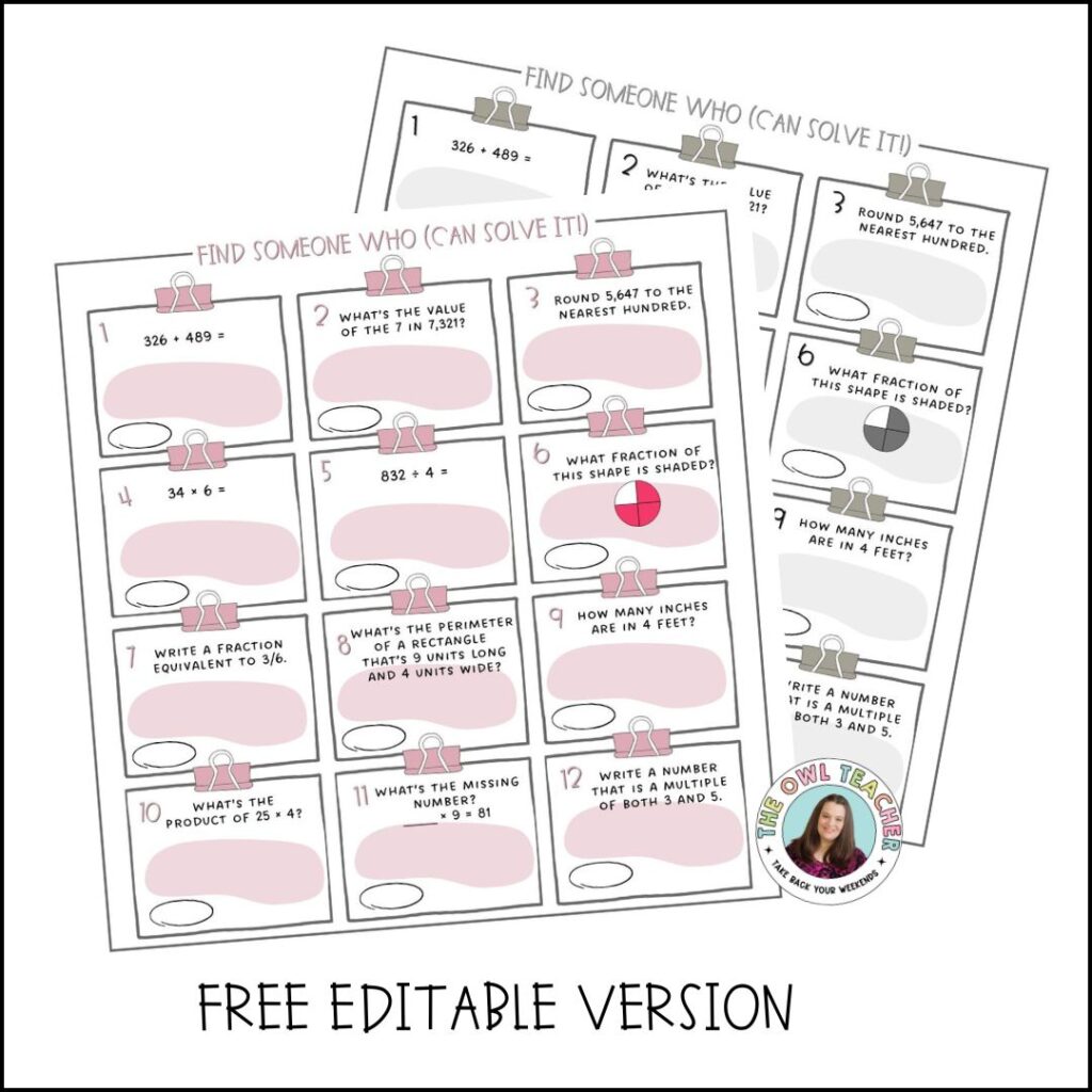 This activity requires very little setup. Students are given index cards printed out or the teacher can place the questions on the board and have students create their own index cards – even their own questions, though the math would need to be included in their questions. Then, of course, model for students. When students are finished, give them one more index card where students reflect on one thing they learned about someone else. You can grab the cards for free here or by clicking on the image below.