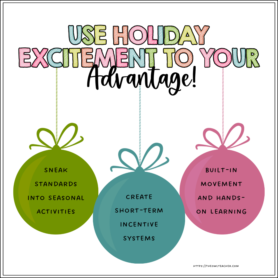 Your students physically cannot sit still for long periods in December, so don’t even try. Make movement part of your lessons instead of fighting against it. Use brain breaks every 15-20 minutes. Incorporate kinesthetic learning activities.
