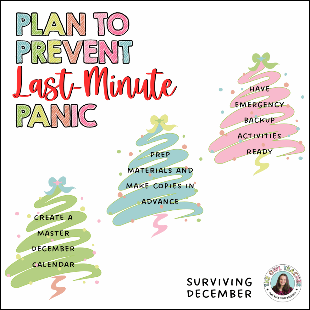 Sit down at the beginning of December (or better yet, late November) and map out the entire month. Include every special event, holiday activity, assembly, party, and deadline you know about. Block out time for progress reports, grading, and end-of-semester tasks.