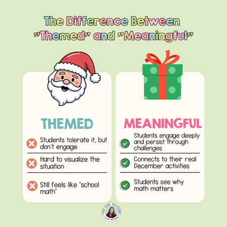 I’ve seen plenty of “holiday” word problems that slap the word “Santa” onto a regular problem. “Santa has 42 presents…” Sure, it’s festive. Does it actually engage students more? Not really.