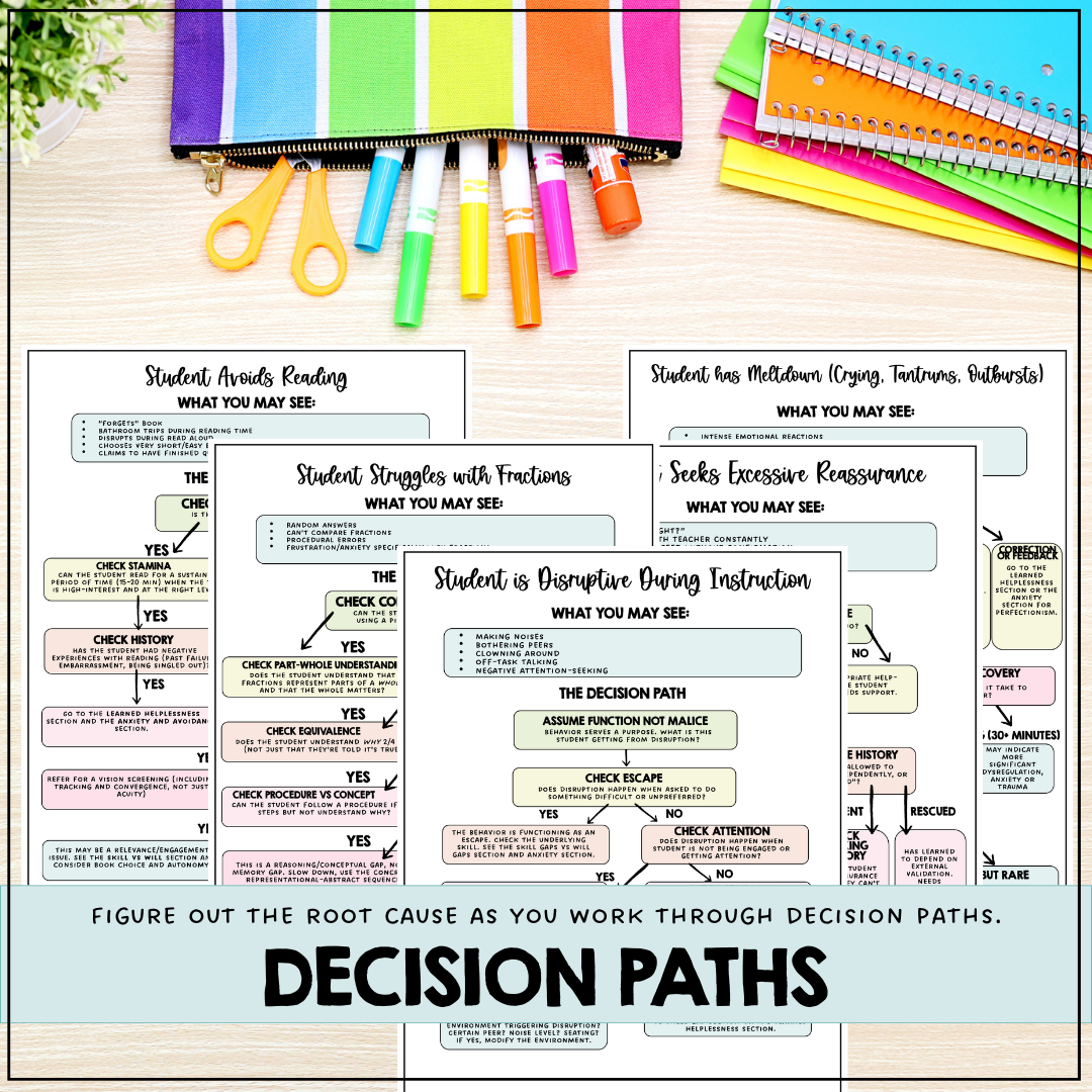 The Decision Pathways act as a diagnostic tool and roadmap for common academic and classroom challenges. You begin with observable behaviors and follow a series of guiding questions that narrow down the likely cause of the struggling learner’s difficulty.